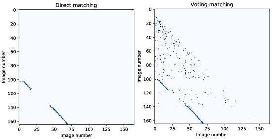 Comparison of a similarity matrix computed by matching directly the visual features and using the voting scheme propose in this work. Each entry in this matrix indicates the similarity between image i and j. The darker an entry is, the more similar the associated images are. The main diagonals were eliminated from these matrices as they only indicate that the same image is similar to itself.