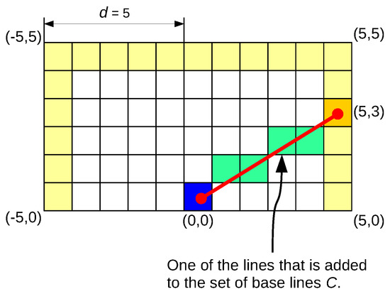 To reduce the computational cost of calculating the lines every time they are needed, we generate them at the beginning of the algorithm. To do this, a grid of rows and columns is defined with the coordinate in the middle of the bottom row as shown in Figure 4. The value of d indicates the length of the sequence to be found. Then, we apply the Bresenham algorithm to the pair of points defined by and every point in the perimeter of the grid. The Bresenham algorithm will generate a sequence of integer coordinates for every pair of points. The set of all base lines will be denoted as C.