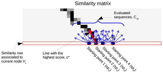 To incrementally find a matching sequence of images in , it is only necessary to find lines starting in the last row of the similarity matrix. Only the entries in the last row with similarity values higher than a threshold are taken into account as starting points. Let be the set of sequences obtained from translating C to every starting point . The set can be obtained from C by adding to every coordinate pair in it. After that, the line with the highest average sequence score from all is obtained. If the average score of is greater than a minimum value the pair of images in that line are considered to be a matching sequence. Then, the matching node for is , where is the second coordinate in ’s starting point. The process of finding the matching sequence is depicted in Figure 5.