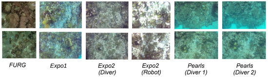 The next datasets are composed of two groups of images that were extracted from videos of the same coral reef during different explorations. We will refer to the first of these two datasets as Pearls. The images in this dataset were recorded by two divers using different cameras moving above a coral reef at different depths. The second dataset is composed of images captured by a diver and our robotic platform navigating above the same coral reef. We will refer to this dataset as Expo2. For both pairs of datasets, the different agents tried to follow the same path during the exploration, however, they were not instructed to follow it exactly. To avoid using all of the images from the recorded videos, we extracted 1 frame per second of each video. Since the exploration was performed at a low speed this sampling rate is sufficient for our experiments. Some examples of the images contained in each of those datasets are shown in Figure 8. Also, we have summarized the important information about each dataset in Table 1. The number of images per dataset in Table 1 is the value obtained after the sampling.