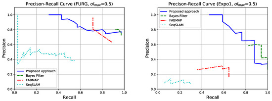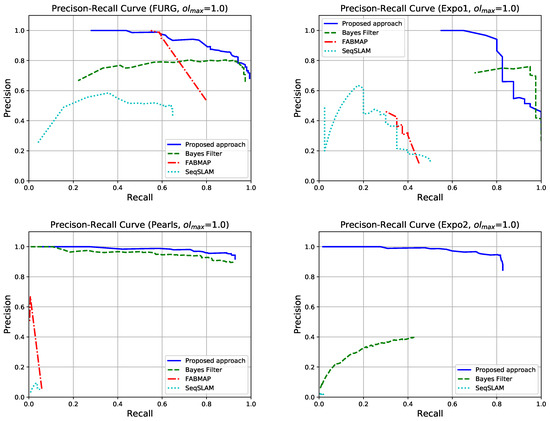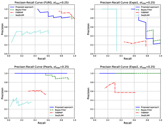 Precision-Recall curves obtained with . A method is not shown in a plot when it was not able to recognize previously seen places.