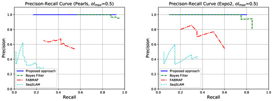 In this section, we present the ability of our method to recognize previously seen places in terms of Precision-Recall curves for the aforementioned datasets. For comparison purposes, we have included a Bayesian filter-based method to recognize places [8]. Also, we included FAB-MAP 2.0 [39] as it is one of the most representative methods based on the Bag-of-Words paradigm. For FAB-MAP, we used the open implementation described in [43]. Finally, SeqSLAM [18] has also been incorporated into the comparison as it is an important piece of work among the sequence-based methods for detecting loop closures. For SeqSLAM, we utilized its open implementation (OpenSeqSLAM: http://nikosuenderhauf.info/code).