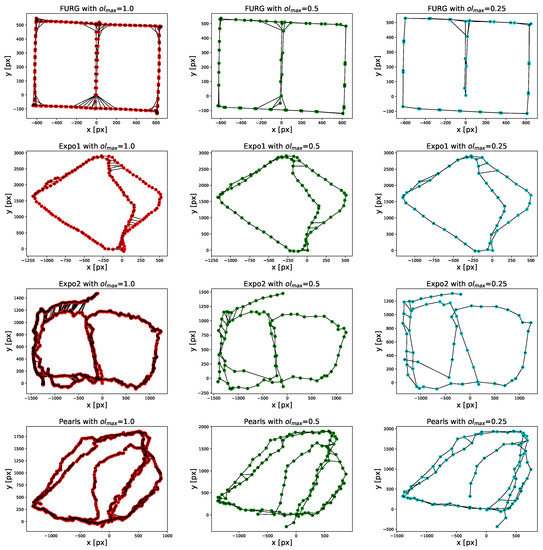 In the previous section, we evaluated the Precision-Recall curves of the proposed algorithm using different overlap factors for keyframe selection. Our solution obtained good results despite using very few images relative to the ones originally contained in each dataset. In this section, we compared the spatial distribution of the nodes in the graph obtained when using only a few images () with respect to the maps obtained when using all of the images in the dataset ().