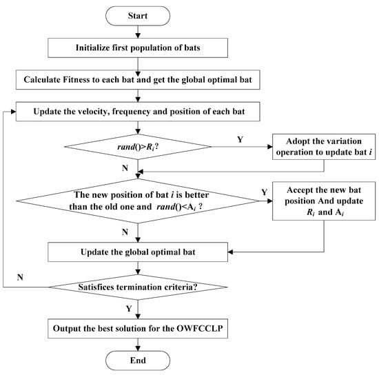 The flow chart of the bat algorithm (BA). OWFCCLP: offshore wind farm cable connection layout problem.