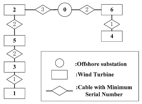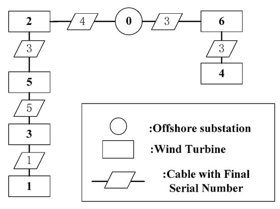 According to the cable’s current carrying limitation, the thinnest cable sectional area (type) will be selected in the first layer. As shown in Figure 3, the selected cable types are 3, 2, 2, 1, 2, and 1, respectively, in this example. Therefore, the cable connection layout based on the minimum cable type selection criterion is decided.