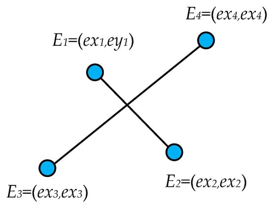 In Figure 6, the coordinates of 4 WTs are shown as , , . If segment E1E2 crosses E3E4, then there and should exist, which satisfy Equation (15) as follows: