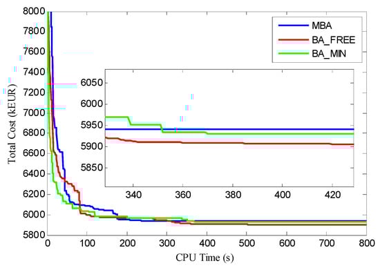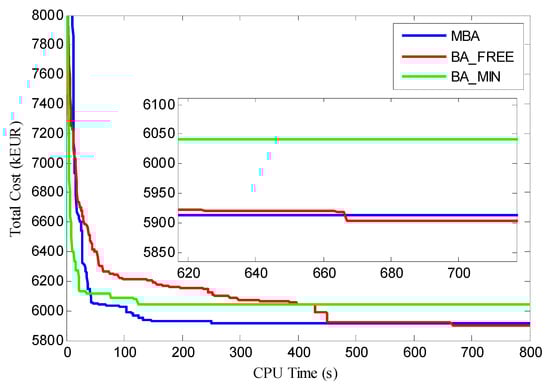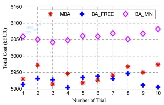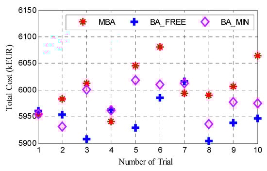 In each scenario, three models are compared. The first model (BA_MIN) forms the cable connection layout scheme according to the minimum cross-sectional cable selection rule, which means the thinnest cable that satisfies the cable current constraint will be selected. The second model (BA_FREE) considers the impact of the cable sectional area selection on the objective function. The last model (MBA) is designed based on the BA_FREE while taking the impacts of crossed cables on the final layout into account. To compare their performances, all the algorithms are run with the same termination criterion: that is, terminated at 800 s. The input parameters of BA are identical for each model: that is Q = 400, θ = 150, α = 0.999, γ = 0.001. Each algorithm is run 10 times independently, and the best results are selected as the global optimal solution. In order to illustrate the selected cable sectional area, different colors are adopted in the following figures. The simulation results of each scenario are included in Table 1.