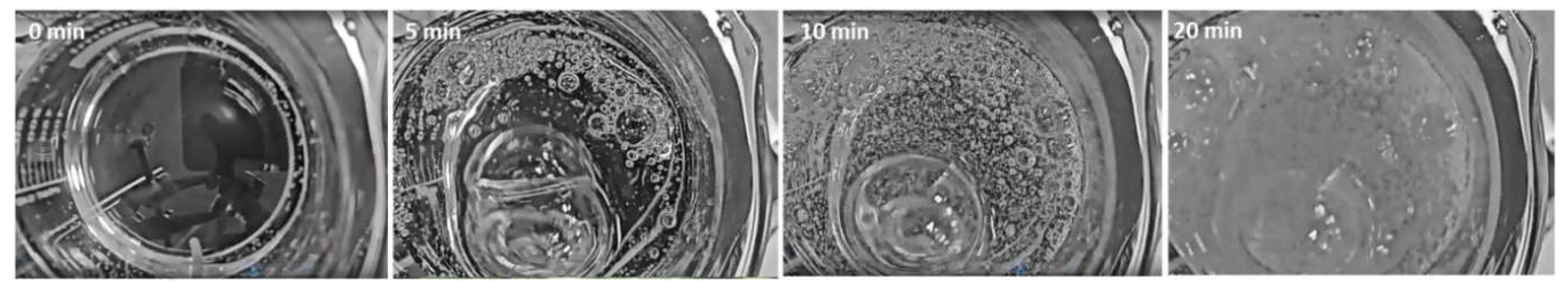 - Reactor n°1. The reactor is a cylindrical glass beaker with a diameter of 85 mm and a height of 105 mm, filled with the molten sugar alcohol (SA) up to 60 mm of height. Air bubbles are generated at the bottom of the vessel by a single tube connected to a pump. The inner diameter of the tube is 3 mm. The pump can provide an air flow rate of 80 L·h−1.
