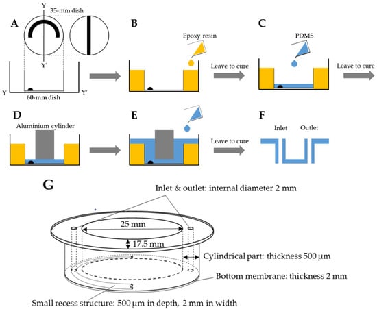 We fabricated an adapter with a small recess structure to control the flow of liquid in a culture dish in a closed environment. To fabricate a PDMS adapter that can be attached to a commercially available culture dish without gaps, a method using a culture dish equipped with a negative structure of a small recess structure as a mold was adopted. A U-shaped small recess structure (U-shaped structure) and an I-shaped small recess structure (I-shaped structure) as shown in Figure 1 were provided in a CD-adapter corresponding to a 35-mm culture dish. A semicircular arc with outer and inner diameters of 32 mm and 30 mm, respectively, and a rectangle with a width and length of 2 mm and 34 mm, respectively, were cut out from a 500-µm thick polyethylene sheet (HRHG711303, KYOWA). The circular arc was pasted on the bottom of a 35-mm culture dish with a 2-mm gap from the edge, and the rectangle was stuck on a line bisecting the culture dish (Figure 2A). The outer periphery of the 35-mm culture dish with a mold structure was filled with epoxy resin (STYCAST 126J PTA, Henkel) for the bearing surface of the adapter. Therefore, as shown in Figure 2A, a 60-mm culture dish was used as a tray, being attached centered under the 35-mm culture dish. Epoxy resin was poured into the gap between both culture dishes, which were left for 9 h to stand at 25 °C to cure the epoxy resin (Figure 2B). After checking that the epoxy resin had cured, 2 mL of PDMS (CAT-106F, Shin-Etsu Chemical) was injected into the 35-mm culture dish and left to stand at 25 °C for 6 h to cure the PDMS (Figure 2C). The reason for setting the volume of PDMS to 2 mL is to make the thickness of the bottom membrane of the CD-adapter 2 mm. Because the bottom area of the 35-mm culture dish is 9 cm2, the volume of PDMS required to make the bottom membrane thickness 2 mm is 1.8 mL. In this study, we set it to 2 mL for easy preparation of the experiments. After confirming that the PDMS had cured, the 35-mm culture dish and the center of a cylinder (aluminum cylinder, Showa Denko, Tokyo, Japan) with a diameter of 25 mm was placed on the PDMS membrane (Figure 2D), and PDMS was poured in a 60-mm culture dish so as not to overflow the edge (Figure 2E). After leaving it at 25 ºC for 9 h to cure the PDMS, the aluminum cylinder and culture dish were peeled off, and the molded PDMS taken out. Using a biopsy punch (BP-L20K, Kai, Tokyo, Japan), a 2-mm diameter hole was drilled at the intersection between the circular arc of the small recess structure and the Y-Y’ part of the fabricated PDMS adapter, and at a linear small recess structure 2 mm away from the edge of the adapter, to serve as an inlet. Similar holes were made on each opposite side to form an outlet (Figure 2F,G). The completed sealed adapter was a cylindrical-shaped PDMS with a 2 mm wide, 500 µm deep recess structure on a 2 mm thick bottom membrane, and an inlet and outlet with an inner diameter of 2 mm (Figure 2G).