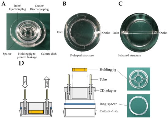As shown in Figure 3D, a transparent framework made of acrylic resin was used as a holding jig to prevent liquid leakage. It has a circular shape so that a constant pressure can be applied to the side of the culture dish for tight sealing. In addition, the center of the culture jig contains a hole with a diameter of 10 mm through which cells can be observed using a microscope. The holding jig has a height of 5 mm and an outer diameter of 27.0 mm. Furthermore, to adjust the amount of medium in the culture dish, a ring spacer was placed between the CD-adapter and the culture dish to raise the adapter. Because the CD-adapter was molded from the culture dish, when the CD-adapter is attached to it, the bottom surface of the CD-adapter touches the bottom of the culture dish. In this study, to set the amount of medium in the culture dish to 2 mL, the ring spacer was made of silicone with a thickness of 2 mm and the CD-adapter was lifted 2 mm from the bottom of the culture dish.
