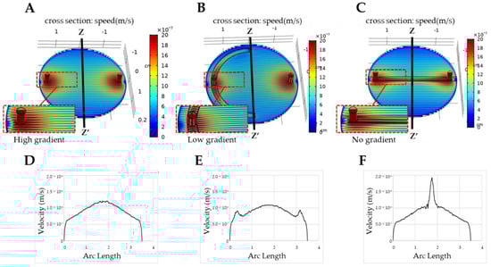 Simulation analysis of liquid flow in a perfusion culture dish with a CD-adapter. Liquid flow in the culture dish at 1.4 µL/min through the inlet was simulated and analyzed using COMSOL. (A), adapter without the small recess structure; (B), U-shaped structure adapter; (C), I-shaped structure adapter. Flow velocity on the Z-Z’ line in (A–C) are plotted in (D–F), respectively. In (F), the liquid flow remarkably increased under the I-shaped groove compared to (E).