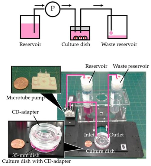 Advances in microfluidic device technology have led to progress in research on perfusion culture [], and it is becoming clear that liquid flow has a large influence on cells. Presently, owing to the progress in microfabrication technology, it is possible to create microscale fluidic devices that are very complex and have a high difficulty of fabrication [], and that allow reproducible cell culture experiments within microchannels [,,]. In fact, studies using microfluidic devices showed that stem cells and iPS cells/ES cells are influenced by shear stress, and this promotes differentiation [,,]. Therefore, the influence of culture medium flow during cell culture is very large. If this flow can be controlled, researchers can modulate the influence of flow on cells, particularly shear stress. However, in culture experiments using microfluidic devices, a skilled technician is required to deliver liquid to the microchannel, and contamination from connection points in the complex structure of the device is often a problem []. Thus, unsolved problems remain in culture experiments using microfluidic devices for practical applications owing to the complexity of the equipment.