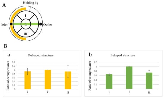 Culture experiments were carried out three times (N = 3), and the adhesion area of cells after 3 days was averaged for each observation point and plotted. Results in i and iii are normalized by value of cell adhesion area in ii in Figure 6A, and the error bars correspond to standard deviation. Adhesion areas of cells in i, ii, and iii was 0.92, 1.0, and 0.92, respectively, in the U-shaped structure adapter, and 0.65, 1.0, and 0.73, respectively, in the I-shaped structure adapter.