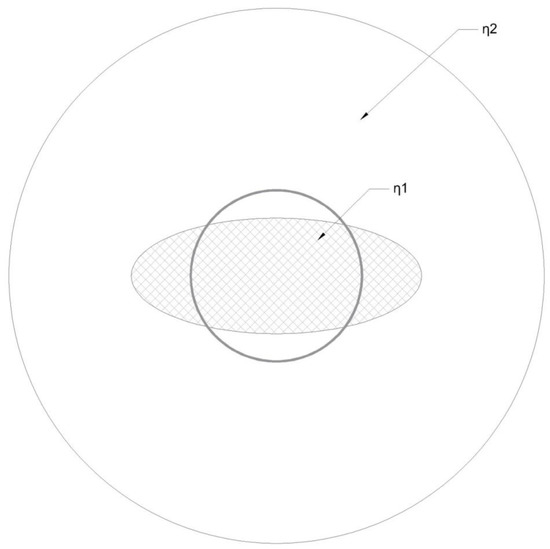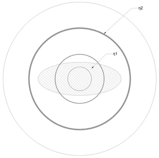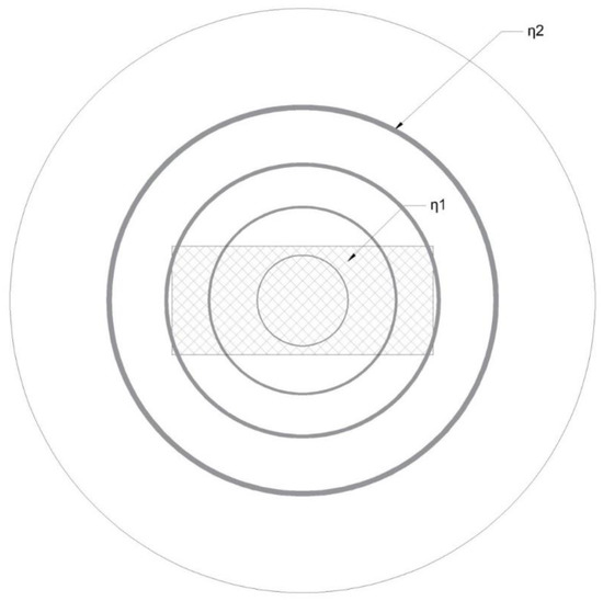 We shall also separate another class of unconventional optical fibers (UOFs) as the ones in which at least in some of its successive thin cylindrical layers present an additional variation of the total index profile along its radial coordinate φ in the form η(r,φ). Such cases include elliptic core, non-symmetric or eccentric core fibers, and in general, all cases of not strictly circular core fibers. In these cases, any discretization into thin cylindrical layers that “cuts” through the core and cladding, results in a variation of the refractive index along φ. In Figure 1, we show such a case of a thin, circular cylindrical layer cutting an elliptic core fiber. As is evident in the schematic, the variation is analogous to the arc length of the circular sector cut by the ellipse for each discretization step.