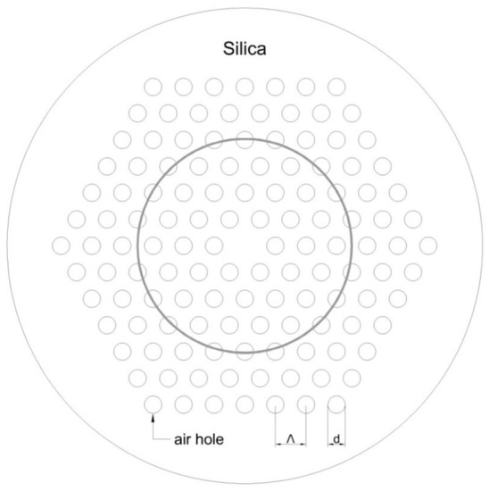 Additionally, photonic fibers made of silica with a set of small air holes around their centers will have many cylindrical layers of varying refractive indexes along θ. In Figure 2, we show an example of a PCF with a hexagonal lattice of 6 rows of air holes.