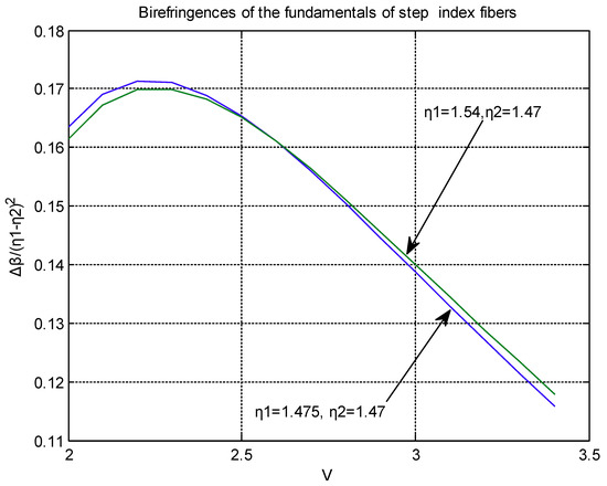 In the following Figure 4, the normalized birefringence of the step-index fibers for n1 = 1.54, n2 = 1.47, and of n1 = 1.475, n2 = 1.47 as functions of V are shown.