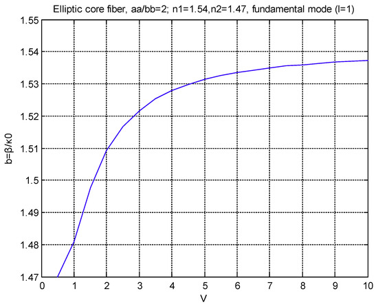 In the following Figure 6, the β diagram of the fundamental even mode of an elliptic fiber with semi axis ratio aa/bb = 2, n1 = 1.54 and n2 = 1.47 and variable factor defined by: ) is shown for completeness in agreement with [32].