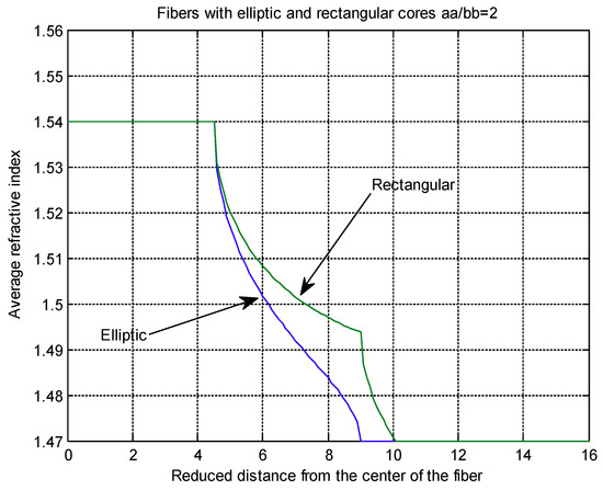 To make a direct comparison, the average refractive indexes as functions of r, for an elliptic core fiber and for a rectangular core fiber of the same aa and bb and aa/bb = 2, are shown in Figure 8. In Appendix B, the MATLAB codes for the average refractive indexes of an elliptic and a rectangular core fiber are given. In Figure 8 we observe that the average refractive index of the elliptical waveguide is dropping off faster than the rectangular and this facilitates the explanation of the stronger birefringence for this case.