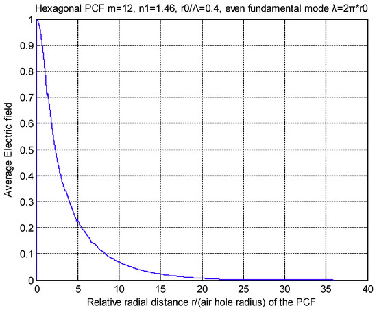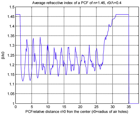 Ιn the case of a holey fiber, we separate the whole fiber circular cross-section into a set of thin cylindrical layers, variable η along φ extending beyond the cladding to take into account the surrounding air with η = 1. Each layer’s thickness is δr = r1 − r2. We can then approximate n(r,φ) as n(φ) for the average r <r> = r + δr/2. The refractive index can be written as a Fourier series, i.e., as . Taking into account the properties of the Fourier Transform we see that so that the expressions in the second terms of Equation (18) spread around a spectrum of harmonics. This is also to be understood as a result of successive scatterings from the bored air holes. We can now use the natural geometry of the usual hexagonal lattice to see that for each set of holes we can have either 6k harmonics. For the fundamental harmonic of = 1, the derived harmonics passing through a layer of 6k holes should be 6k + 1. Thus, for the fundamental wave crossing the successive layers it “sees” a different set of periodic rectangle functions that will be shown rigorously to contribute a different number of harmonics (7, 13, 19, …).