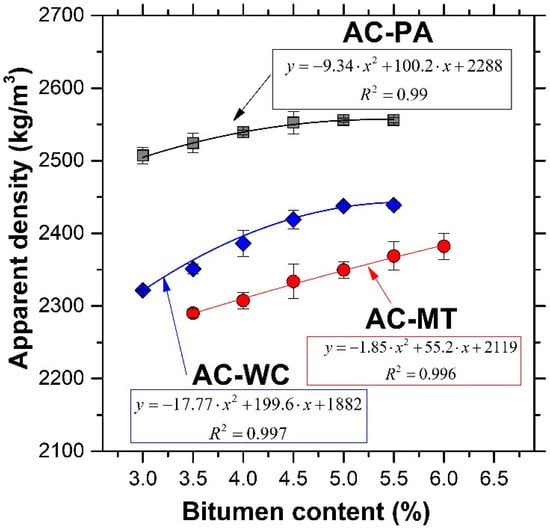 Apparent density as a function of bitumen content for the AC-PA, AC-WC, and AC-MT mixes. The error bars represent ±1 standard deviation. The best second-order polynomial fit and the square of the multiple correlation coefficient, R2, are also shown.