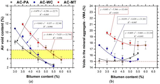 (a) Air void content (Vh) and (b) voids in the mineral aggregate (VMA) of the AC-PA, AC-WC, and AC-MT mixes. The error bars represent ±1 standard deviation. Included are the equations of the best fit second-order polynomials and their R2 value.