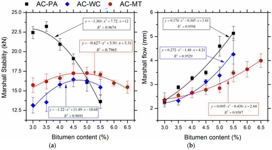Figure 4 gives the values for the Marshall Stability and the Marshall flow as a function of bitumen content for each of the studied mixes. Once again, the data represents the mean bitumen content and standard deviation computed from measurements made on three specimens. Additionally, the graph shows the best fit second-order polynomial along with its R2 value that verifies a good fit. As Figure 4 shows, the AC-PA mix shows a drop in stability with increasing bitumen content. However, the AC-WC and AC-MT mixes show an increase in stability with increasing bitumen content up to a point where both reach a maximum value of about 4.7%, after which both slowly decrease for a higher bitumen content. The results show that the mixes made with mine wastes are less sensitive to binder content.