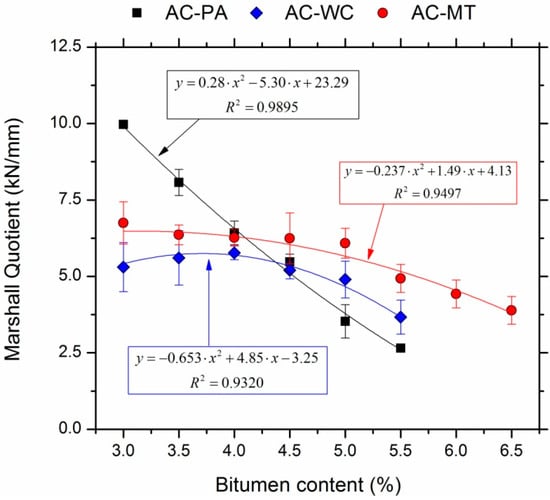Figure 5 shows the Marshall quotient and its best second-order polynomial fit as a function of bitumen content for the studied mixes. The Marshall quotient may be used to evaluate the rigidity of the mixes, with high values representing greater rigidity, corresponding to a more resistant material [,,]. The AC-PA mix had a higher Marshall quotient with a low bitumen content than the AC-WC and AC-MT mixes, indicating that these mixes are more rigid and more resistant than the mixes made with mine wastes.