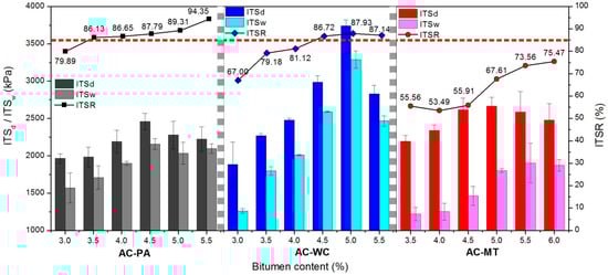 The ITSR value of all of the mixes increased with increasing bitumen content, principally due to the fact that the thickness of the mastic layer is greater in mixes with a higher bitumen content []. As may be observed in the figure, the values of ITSR for the AC-PA control mixes exhibited ITSR values in excess of 85% in specimens with a bitumen content higher than 3.5%. The AC-WC mixes exhibit maximal ITSR values in specimens with a bitumen content higher than 4.5%. The AC-MT mixes did not comply with the minimum 85% requirement for any of the bitumen contents studied, which is an indication of low adhesivity between the binder and the aggregate. The low ITSR of the AC-MT mixes is also due to that fact that a significant part of the bitumen is absorbed by the aggregate, which lowers the effective bitumen in the mix, and consequently, the thickness of the binder film that covers the aggregate, which, in turn, promotes the disassociation of the aggregate under exposure to water.