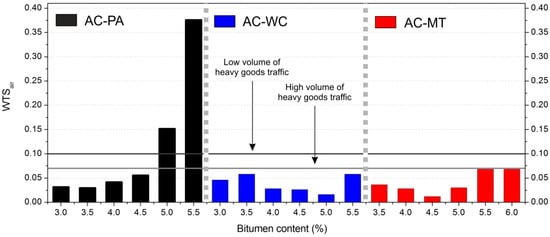 In Figure 7, the mean Wheel tracking slopes (WTSair) as a function of bitumen content for the various mixes are shown. The data was obtained from the tests described in Section 2.3.3. The horizontal lines in the graph represent the maximum permitted value (according to Spanish norms) of the WTSair parameter for both high-volume and low-volume heavy vehicle traffic.