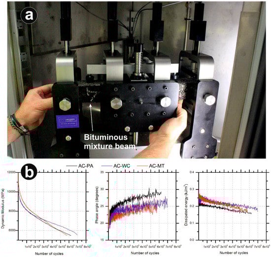 In this research, the fatigue resistance was obtained through a four point besting test carried out on strain control and with a repetitive sinusoidal loading configuration, as can be seen in Figure 8a. Figure 8b illustrates an example of the fatigue results on AC-PA, AC-WC, and AC-MT samples. Since the load and displacement were continuously measured during the test, parameters like dynamic modulus, phase angle, and dissipated energy could easily be calculated and plotted, as can be seen in the example of Figure 8b. Shown are the dynamic modulus, phase angle, and dissipated energy as a function of number of test cycles for typical tests. It is apparent that the dynamic modulus decreases with the number of cycles. The phase angle increases with the number of cycles, demonstrating the degradation of the mix, as well as its loss of rigidity. Over the length of the test, which simulates the useful life of the road service, the energy dissipated per cycle is reduced as the sample suffers from fatigue effects.