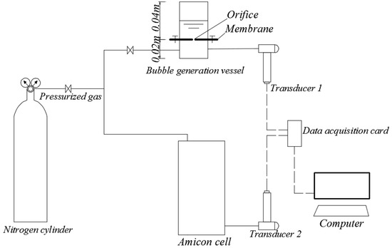 Figure 1 shows the bubble formation model of a pressure decay test setup for a membrane system. It assumes the following: (1) The air in the pressurized volume of the membrane system is in the quasi-equilibrium state. (2) The gas pressures inside the bubble and in the membrane gas chamber are both uniform within their respective volumes. (3) The liquid is incompressible. (4) The air flowing through thin-walled orifice is an unsteady isothermal flow process for high-pressure air flow. For a specific moment, the flow can be seen as a steady flow, and the flow loss can only be a local loss. (5) As has been developed by Farahbakhsh et al. [