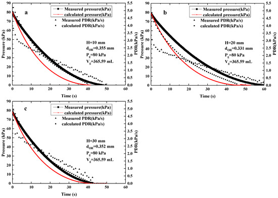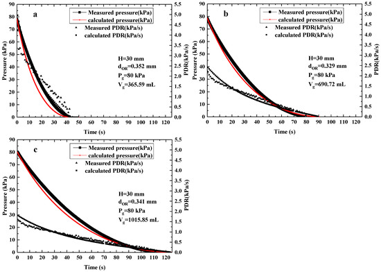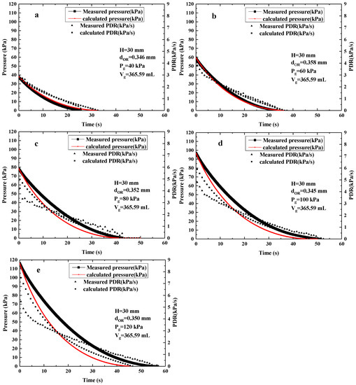 Section 4.2, the measured pressure values were not always more than the simulated pressure values; instead, the measured pressures were higher than the simulated pressures when the applied pressure was less than 80 kPa. As for the PDR, the difference between the measured PDR and the calculated PDR changed with time, and it was relatively small in the middle of the pressure decay time. This correlation is demonstrated in