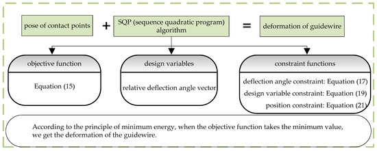 In this paper, the deformation of the guidewire in the blood vessel is studied according to the principle of minimum energy. The advancement of the guidewire in the blood vessel can be seen as a quasi-static process. Therefore, taking the guidewire as the research object, in order to minimize the elastic potential energy of the guidewire, all the light rods between the contact points of the guidewire need to constantly adjust their pose to optimal states. We will construct a mathematical model based on the principle of minimum energy below, and use a sequential quadratic programming (SQP) algorithm to solve the mathematical model, and transform the deformation problem of the guidewire into a nonlinear programming problem under multi-constraint conditions.