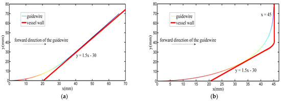 Optimized guidewire shapes for different contact conditions. (a) The equation for an oblique vessel wall is y = 1.5x − 30; (b) The equation for a vertical vessel wall is x = 45.
