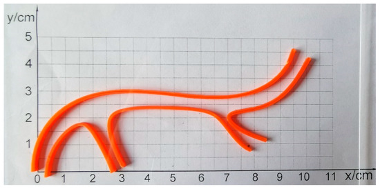 The experimental platform is shown in Figure 11. A simple blood vessel model is made in SolidWorks and printed with a 3D printer. The orange objects in the picture, with width of 1.5 mm and thickness of 0.8 mm, correspond to our sample vessel wall. The vessel wall is affixed to the surface of a transparent acrylic sheet with scale paper, and another acrylic sheet is affixed over the vessel wall. When the guidewire advances inside the blood vessel, the position of the contact point of the guidewire with the blood vessel wall and the deflection angle can be obtained from the scale paper. In order to obtain the length of the guidewire from the contact point to the entrance of the blood vessel (O), the position of the contact point can be marked on the guidewire with a highlighter, and after the guidewire is taken out, the corresponding length is measured with a scale.
