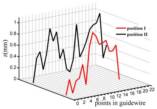 In the experiment, the guidewire inside the blood vessel was marked with a highlighter every 5 mm, and the coordinates on the scale paper were recorded, then compared twith the coordinates of the corresponding points obtained by the algorithm. As is shown in Figure 14, we use z to represent the distance between the two coordinates of the same point, which is the error between the algorithm simulation and the real experiment.