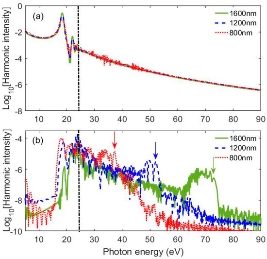 - Zhu, X.; Liu, X.; Li, Y.; Qin, M.; Zhang, Q.; Lan, P.; Lu, P. Molecular high-order-harmonic generation due to the recollision mechanism by a circularly polarized laser pulse. Phys. Rev. A 2015, 91, 043418. [Google Scholar] [CrossRef]