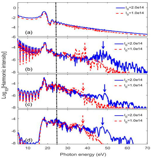 To explore the universality of the above phenomenon, various envelopes and laser intensities for the driving field are considered. The results are presented in Figure 2a–d for the cases of a constant amplitude (panel a), a trapezoidal envelope (panel b), a gaussian envelope (panel c), and a sine-squared envelope (panel d), respectively. Here, we consider two different pulse intensities of and . The wavelength of the driving field is fixed at 800 nm. The total interaction time is 10 optical cycles for all the cases, where the rising and falling time of the trapezoidal pulse is two optical cycles. As shown in these figures, a similar phenomenon to that in Figure 1 is observed. Namely, in the case of constant amplitude shown in Figure 2a, there are no significant signals above the ionization energy and the spectrum is not influenced significantly by varying the laser intensity. Whereas, when the field is added a finite envelope, the typical features of the harmonic spectrum appear. For each harmonic spectrum shown in Figure 2b–d, there is a plateau above the ionization energy and followed by a cutoff. The cutoff positions are almost the same for the three different envelopes when the intensities of the driving pulses are the same, as indicated by the red dashed and blue solid arrows in Figure 2b–d. But the cutoff position is extended when increasing the pulse intensity. Moreover, the cutoff position satisfies for all the cases. Hence, the high-order harmonics caused by the recollision mechanism are significantly suppressed, unless the driving field possesses an envelope. It is indicated that the time-varying amplitude of the driving field plays an important role in the electron return to the parent ion.