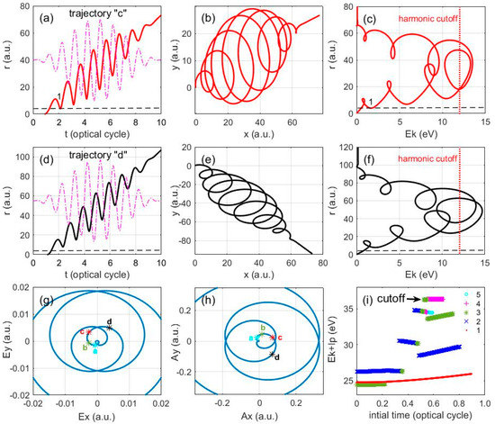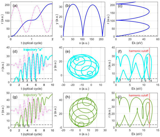 To explain the above finding, we perform an analysis of the classical trajectory of the electron in circularly polarized laser fields. As examples, the laser fields with constant amplitude and a sine-squared envelope are considered. The intensity, wavelength, and pulse duration of the two driving laser field are respectively , 800 nm, and 10 optical cycles. The corresponding harmonic spectra are presented by the red dotted curves in Figure 1. By solving the Newton’s Equation of the freed electron in the two driving laser fields, the classical trajectories of the electron are obtained. For both two laser fields, the electron is set to start from the origin at zero velocity [18,19]. The electron return is determined by the distance between the electron and the parent ion r. When r is less than 4 a.u., then we treat this situation as an efficient return to the parent ion [33]. In Figure 3 and Figure 4, we present a typical trajectory for the laser field with constant amplitude (Figure 3a–c) and four typical trajectories for the sine-squared laser field (Figure 3d–i) and Figure 4a–f). We denote the four typical trajectories of sine-squared laser field as trajectory “a” (Figure 3d–f)), trajectory “b” (Figure 3g–i), trajectory “c” (Figure 4a–c), and trajectory “d” (Figure 4d–f), respectively. The time-dependent r, the two-dimensional displacement of the electron, and the evolution of the electron kinetic energy for each trajectory are presented in the first, second, and third columns of Figure 3 and Figure 4, respectively. In Figure 3a,d,g, and Figure 4a,d, the x component of the electric field is presented by the pink dash-dotted curve. In addition, the electric field and the vector potential at the initial time for the four typical trajectories of sine-squared laser field are also depicted by the corresponding characters in Figure 4g,h, respectively.