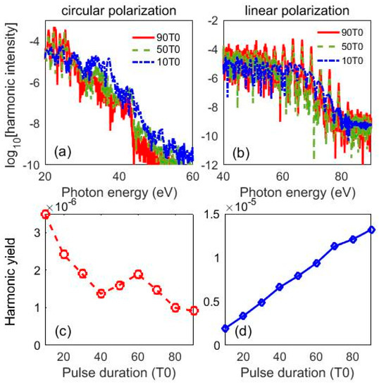 (a–b) Pulse-duration dependence of high-order harmonic spectrum for circularly polarized (a) and linearly polarized (b) sine-squared laser fields. The intensity and wavelength of the laser fields are fixed at and 800 nm, respectively. (c–d) Pulse-duration dependence of integrated harmonic yields for circularly polarized laser field from 27.19 eV to 37.19 eV (c) and linearly polarized laser fields from 56.67 eV to 66.67 eV (d).