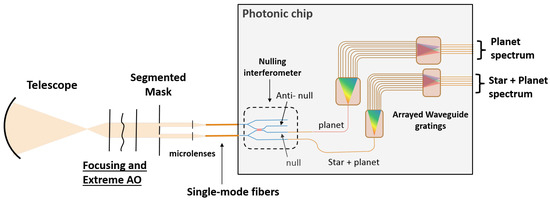 A nulling interferometer is an offshoot of the technique described above, where an extra phase delay of is added to one of the two combining beams to create destructive interference of the central source (e.g., a bright star), making any off-center source visible (e.g., a planet). A photonic nulling interferometer called GLINT has recently been demonstrated which can be used for observing exoplanets, possibly able to measure their spectra in the future [53]. A current analogue which offers these functionalities (R ∼ 20, 500, 4000 and angular resolution of tens of milliarcseconds in the K-band) is the GRAVITY instrument—a VLT interferometer [54,55,56]. A photonic counterpart of GRAVITY will be shoebox-sized, with improved mechanical stability, thus allowing deeper observations of faint, background-limited sources. A sample schematic of such a future device is shown in Figure 3.
