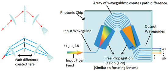 Arrayed waveguide gratings are a widely used technology in the telecommunication industry and a direct photonic analogue of a conventional diffraction grating spectrograph, as shown in Figure 4. The concept of AWGs, first presented in 1988, is based on a phased array of channels/antennae in radio receivers and transmitters [58,59]. A single-mode fiber couples to a single-mode waveguide on the chip. The input waveguide illuminates an array of single-mode waveguides through a slab waveguide, called a free propagation region (FPR). Each waveguide in the array has an identical path difference, with respect to its adjacent waveguide, where m is the central spectral order and is the central wavelength. The emergent light interferes in the output FPR and forms constructive interference fringes of different wavelengths within a spectral order (where free spectral range ∼) at different locations on the Rowland circle. Thus, the wavelengths within a spectral order are dispersed horizontally. The discrete resolving elements can then be sampled by output waveguides.