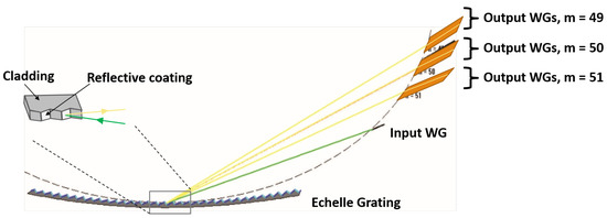 Another photonic technique based on a conventional spectrograph is photonic echelle grating (also called planar concave grating) spectrograph. A sample schematic is shown in Figure 5. The light from a single mode fiber is coupled with the input waveguide which then illuminates the grating through the free propagation region. The grating teeth are designed to have reflectivity, which creates constructive interference fringes for different wavelengths in a spectral order at different locations in the focal plane. The gratings can be designed to focus most of their light in a particular order by controlling the blazing angle. The geometry of echelle gratings can be designed in many ways, the most common being the Rowland circle method [7], the two-point stigmation method [74], and perfectly chirped gratings [75]. The high-efficiency reflection can also be achieved in a few different ways, such as by coating the vertical surface of grating teeth with reflective material like chromium or silver [76,77,78] or using distributed Bragg reflectors (DBRs) [79].