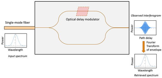 The concept of a Fourier transform spectrograph (FTS) has been around in astronomy for over half a century now [82,83]. A conventional FTS is an adaptation of a Mach–Zehnder interferometer with a way to precisely control the optical path delay between two identical beams created using a beam splitter. Precise control of the path length necessitates an ultra-stable structure for the FTS. A photonic FTS can easily resolve this issue by having a monolithic and miniaturized on-chip construction which, to a great extent, eliminates mechanical and thermal fluctuations. The schematic of a FTS is shown in Figure 6. The input fiber carrying the astronomical light is coupled with a waveguide which symmetrically splits into two identical waveguides (i.e., a 1 × 2 beam splitter). An optical delay modulator introduces a precise and known optical delay in one of the waveguides. The phase modulation is typically achieved using thermal [84,85] or electro-optical modulation [86,87,88]. The beams are combined and the power is measured using a single-element detector. By varying the path delay, an interferogram is constructed. The envelope of this interferogram is the Fourier transform of the incoming spectrum. Thus, the input spectrum is retrieved by inverse Fourier transform of the envelope.