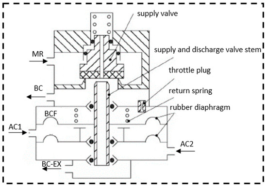 The relay valve (Figure 2) is mainly composed of a supply valve, a supply and discharge valve stem, a return spring, a throttle plug, rubber diaphragms, a feedback chamber (BCF), and pre-control chambers (AC1, AC2) [6]. The upper chamber of the supply valve is connected to the brake supply cylinder (MR), and the lower chamber is connected to the pressurized cylinder (BC).