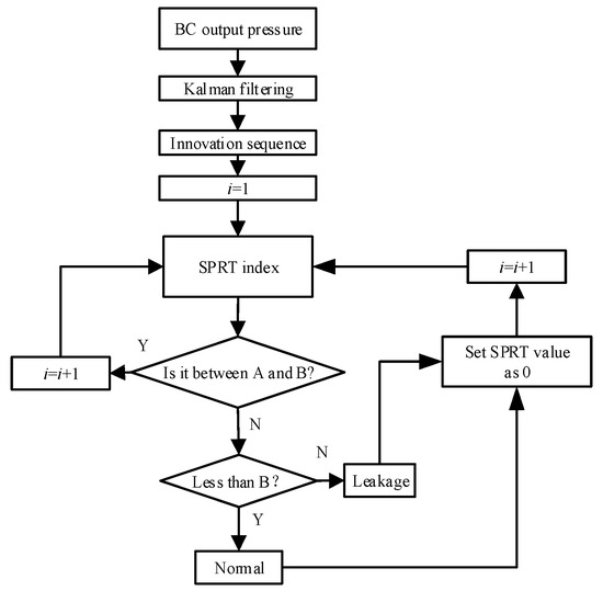 However, during long-term operation, leakage faults may occur due to the wear of rubber seals, spring fatigue, and mechanical jams caused by grease failure. These faults may degrade the performance of the pneumatic unit and even cause functional failures, such as the brakes not releasing or providing insufficient braking power, all of which can affect operational safety and efficiency [4,5,6,7,8,9]. Although the existing brake system has a diagnostic function, this function offers a system-level fault diagnosis and does not have a component-level fault warning function. When the leakage of a pneumatic unit occurs, the most noticeable result is a change in pressure. Consequently, the pressure state can be monitored to identify and diagnose latent leakage problems. As a statistical test method, sequential probability ratio test (SPRT) is commonly used for on-site monitoring and isolation of abnormalities. Compared to conventional threshold detection methods, SPRT requires the smallest average number of samples for the fault detection of signals, which means that a developmental fault signal can be indicated earlier with the same accuracy. Meanwhile, considering the particularity of the braking system—that is, the braking force required by the vehicle under a different vehicle load and braking level is different—it is difficult for the traditional SPRT to prepare a complete training set. In this paper, the Kalman predictor is used to preprocess the pressure signal, and the innovation sequence obtained by Kalman filtering is used as the detection signal of SPRT.