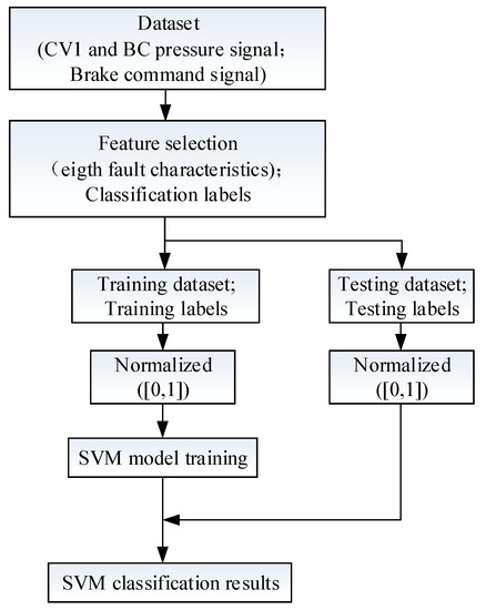 Due to the distinct impacts of different leakage faults, this paper extracts fault characteristic parameters to realize the fault diagnoses of relay valve leakages, to provide guidance for maintenance decisions and save maintenance costs. At present, the most efficient diagnostic methods for hydraulic (pneumatic) system faults mainly include the fault tree [10], the Back Propagation (BP) neural network [11,12,13], and the expert system [14]. Among them, the fault tree has great limitations in online diagnosis. The BP neural network method has a slow convergence speed, which lengthens the training time, and makes it easy to get the local minimum; conversely, the amount of data required by the expert system is relatively large, and the diagnostic results can be inaccurate. The support vector machine (SVM) [15,16] algorithm has special advantages in small sample, high dimensional, and nonlinear problems. From a theoretical point of view, the SVM algorithm obtains the global optimal solution, which makes up for the fact that the BP neural network method can easily fall into the local extremum. At the same time, the SVM can obtain higher diagnostic accuracy under small sample training and fixes the expert system method’s low diagnostic rate in the case of incomplete samples.