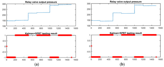 (a) Relay valve internal leakage Kalman and SPRT test results and (b) relay valve external leakage Kalman and SPRT test results.