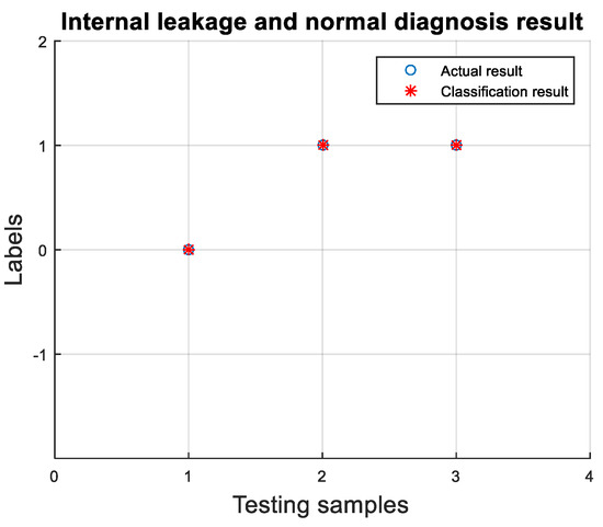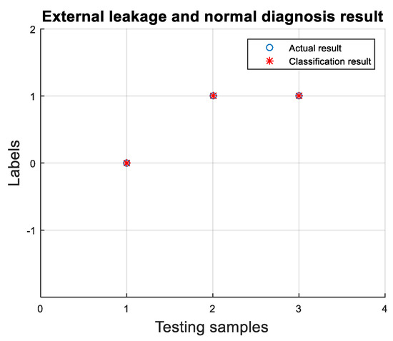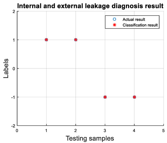 In this paper, internal leakage and external leakage are classified first: “1” stands for internal leakage, and “−1” stands for external leakage. The diagnostic results are shown in Figure 7. Next, internal leakage and normal sequence are classified: “1” stands for internal leakage, and “0” stands for normal. The diagnostic results are shown in Figure 8. Finally, for normal and external leakage, “0” stands for normal, and “1” stands for external leakage. The diagnostic results are shown in Figure 9.