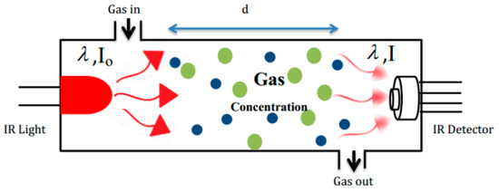 The working principle of a typical NDIR spectrometer is based on the Beer–Lambert’s theorem to describe the relationship between the infrared wavelength (λ), gas concentration (C), absorption medium length (d), and intensity of light source (I), shown in Figure 1. The NDIR spectrometer consists of three basic components: an infrared light source; an optical tube containing target gas concentrations; and an infrared sensor with a specific bandpass filter.